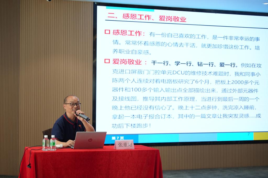 张重阳是广州地铁运营事业总部首席技师,曾荣获2021年度“全国五一劳动奖章”,2013年度“第五届广州道德模范”,2016年度“南粤工匠”等荣誉称号,2017年当选为广州市第十五届人民代表大会代表,2020年被评为“全国劳动模范”。张重阳在讲座中列举多个历史劳模人物,讲述劳动精神,从思想上引导学生热爱工作,扎根基层专注工作,叮嘱学生干一行、爱一行,感恩工作机会,培养职业自豪感。
