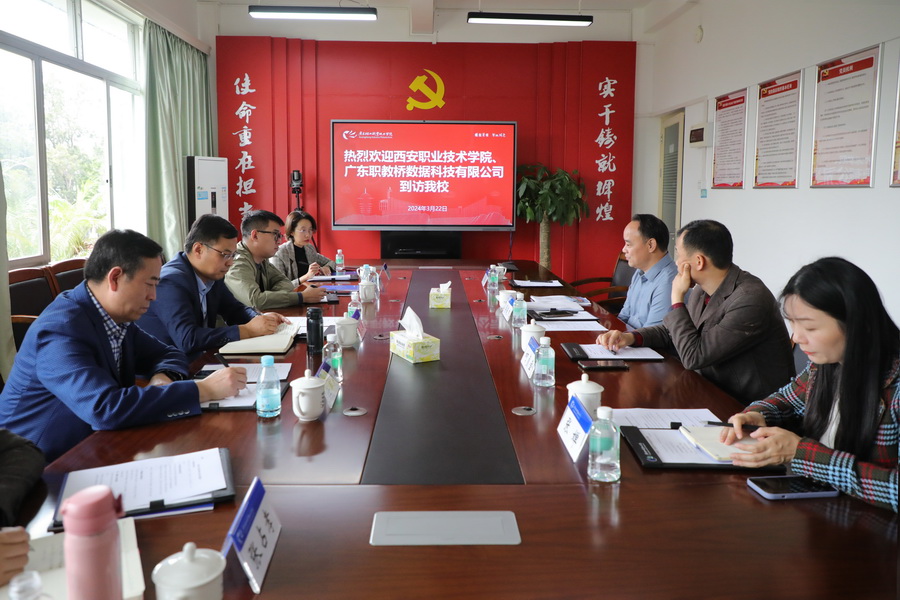 3月22日,西安职业技术学院副校长袁卫敏一行3人和广东职教桥数据科技有限公司副总经理刘伟平一行2人到我校新港校区学习交流,学校副校长廖俊杰在办公楼二楼会议室进行接待。