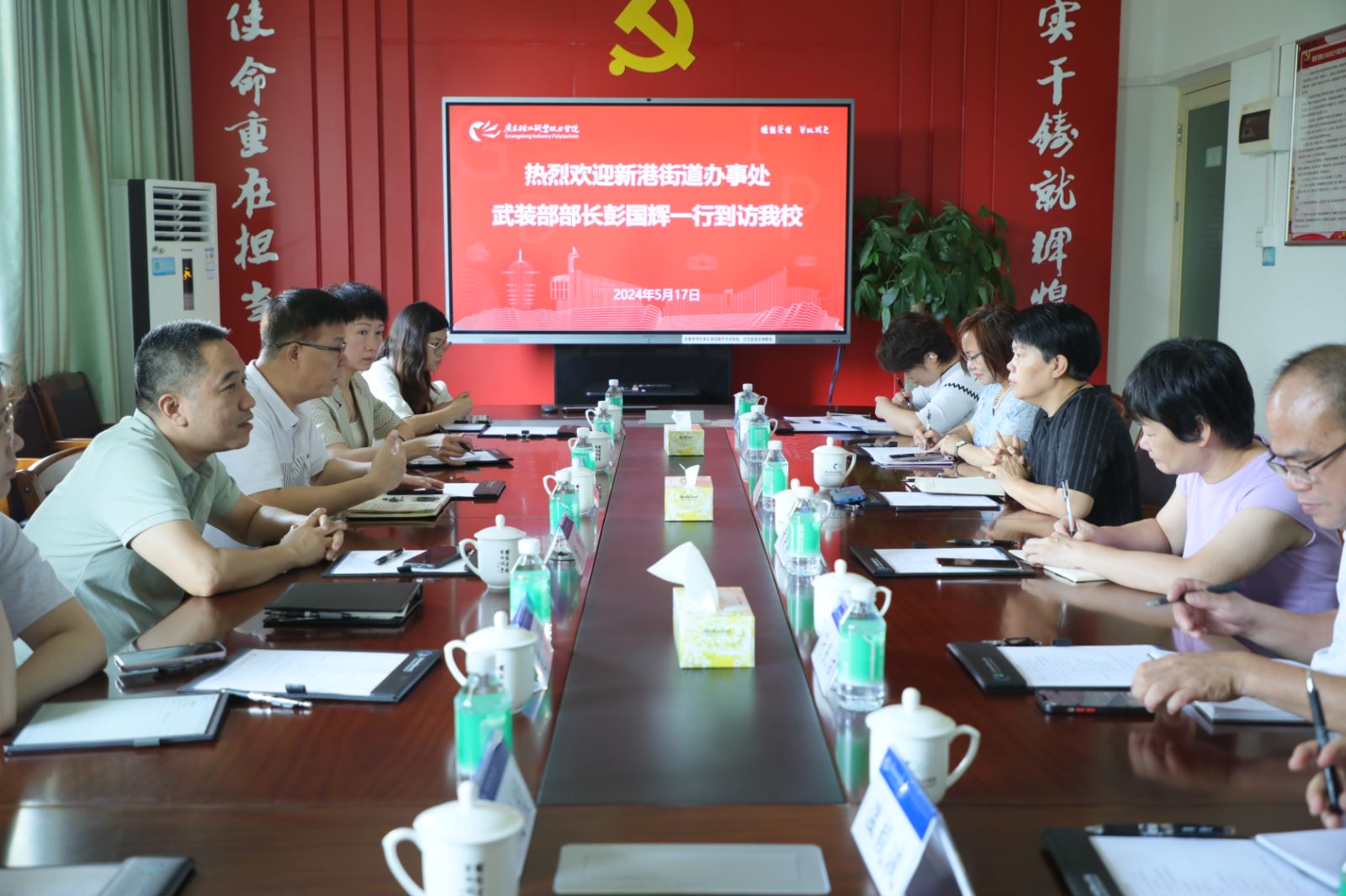 5月17日,新港街道办事处武装部部长彭国辉一行6人到访我校,学校副校长李荣在新港校区办公楼二楼会议室接待了到访客人。