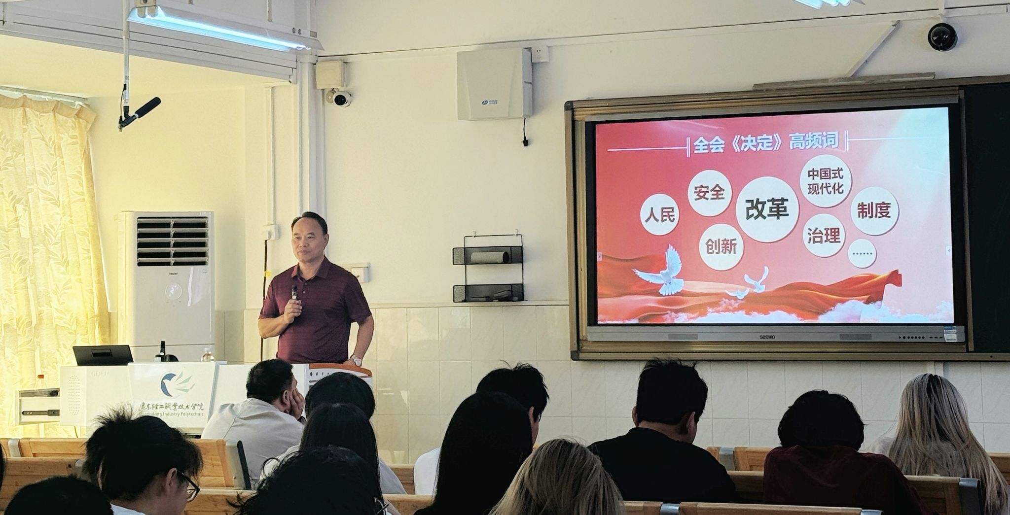 10月25日上午,梁艳珍在新港校区第一实训楼105室,以“改革攻坚听党话 青春建功跟党走——学习贯彻党的二十届三中全会精神”为题,为国商243、244班的同学们上课。梁艳珍带领同学们学习了党的二十届三中全会精神,深入分析了中国式现代化的科学内涵,勉励同学们努力成长为堪当民族复兴重任的时代新人。