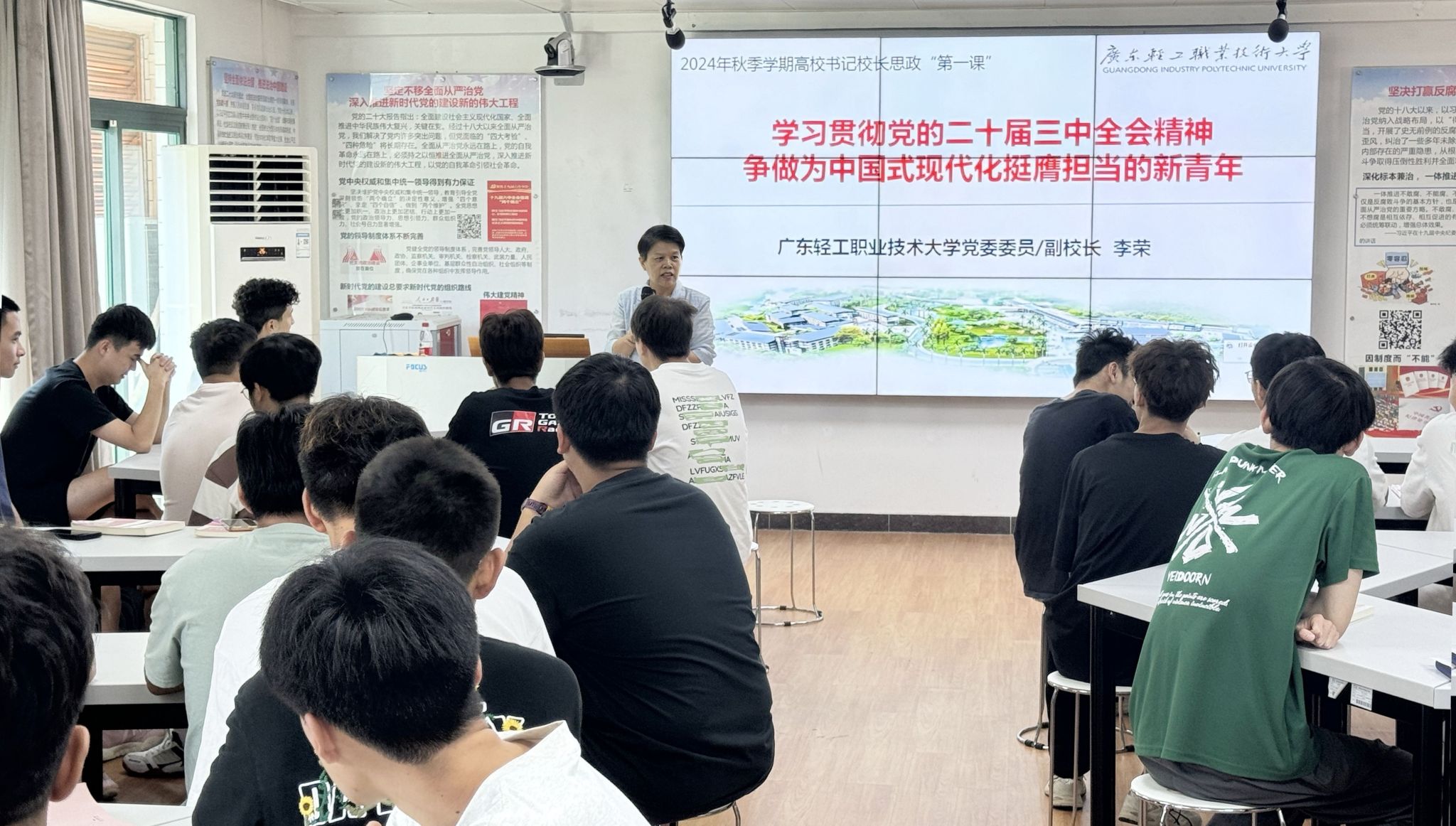 10月10日下午,李荣在南海北校区行政楼3304室,以“学习贯彻党的二十届三中全会精神、争做为中国式现代化挺膺担当的新青年”为题,为汽检231班、汽智231班的同学讲课。李荣结合我校人才培养方案和实施计划,希望同学们能够锤炼批判性思维能力,为肩负起中国式现代化的使命重任做好充分准备。(文/马克思主义学院 图/广轻融媒体中心)