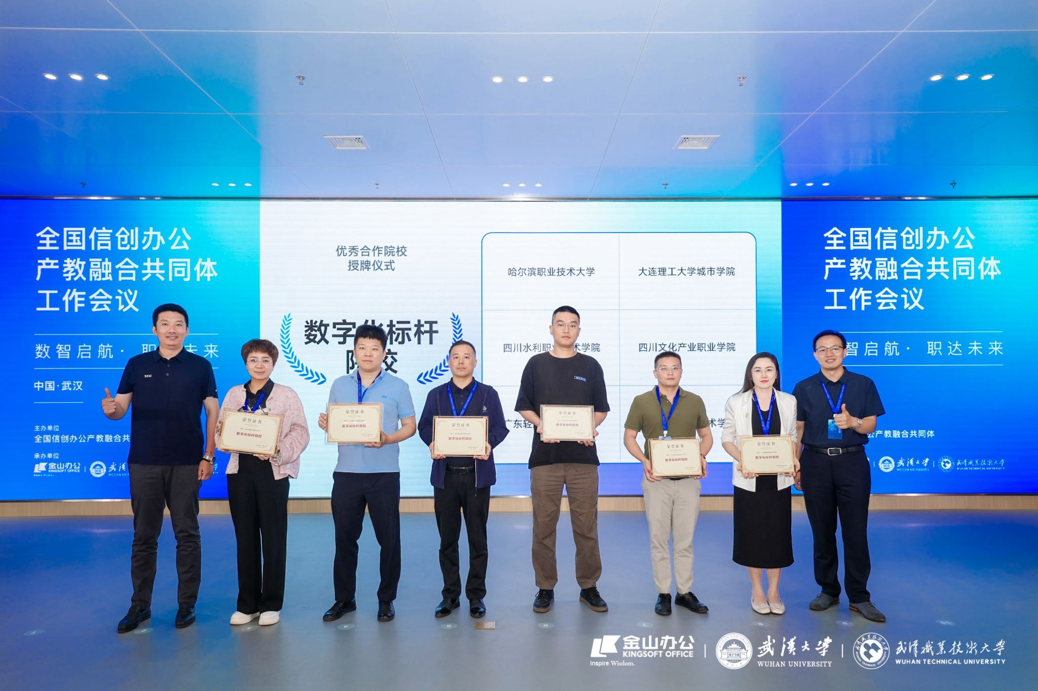 近日,由全国信创办公产教融合共同体主办,北京金山办公软件股份有限公司、武汉大学、武汉职业技术大学联合承办的全国信创办公产教融合共同体首次工作会议在武汉举行。来自全国职业院校、行业龙头企业的百余位专家代表齐聚一堂,共商信创领域产教协同发展新路径。我校凭借在职业教育数字化转型和产教融合领域的突出成果,成功当选为共同体“理事单位”,并被授予“数字化标杆院校”荣誉称号。