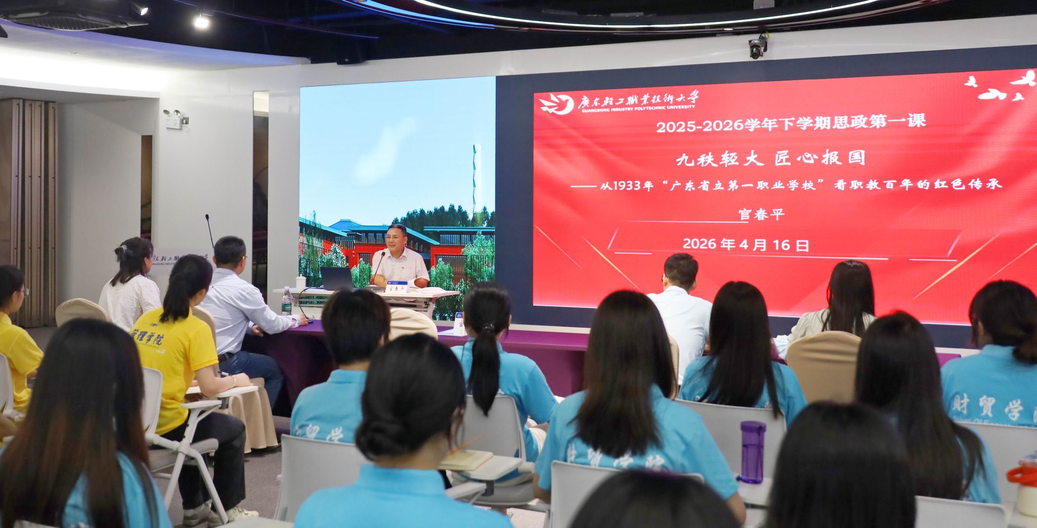 4月16日下午,官春平在新港校区多功能展示中心,为管理学院酒管243、会计242同学讲授题为《匠心报国——从1933年广东省立第一职业学校看职教百年的红色传承》的思政第一课。他以“一块奠基石”与“八次迁徙”的校史故事为切入点,系统回顾学校从1933年建校至今的发展历程,深刻阐释不同历史时期学校以技报国、育人兴邦的使命担当,并勉励同学们从校史中汲取力量,珍惜时代机遇,夯实专业本领,传承匠心精神,将爱国情、强国志、报国行融入成长全过程,努力成为可堪大用的技术技能人才。