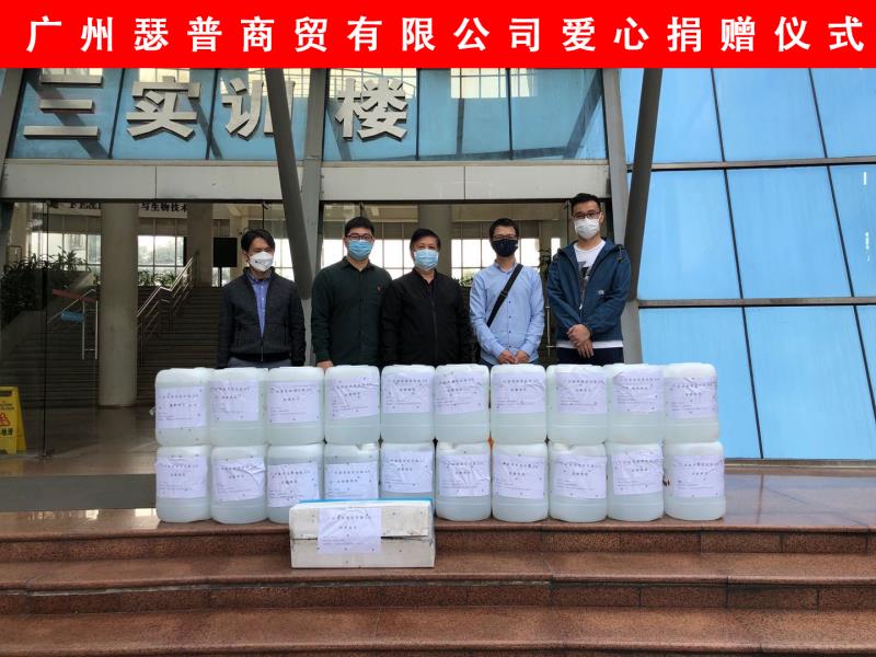 2020年2月28日下午,受广州瑟普商贸有限公司经理曾志玉委托,公司员工黄学军代表公司向我校捐赠20桶(共1000斤)75%医用酒精和喷壶1批,学校工会主席陈东华代表学校在南海校区第三工业实训楼前接受捐赠,并对慷慨捐赠、无私奉献的校友和校友企业表示敬意和感谢。校办副主任麦晓冬、学院副书记吴忠坤、教务处郭海库老师参加了捐赠仪式。