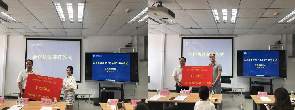 随后,廖俊杰代表校方与两个公司分别签订合作协议并进行学生奖学金捐赠仪式。两家企业共捐赠奖学金41000元,作为商英、应英专业品学兼优的学生奖励基金。