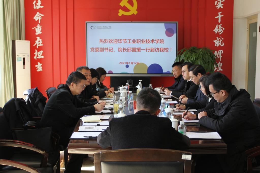 1月12日上午,毕节工业职业技术学院党委副书记、院长邱国援一行7人到访我校,学校党委副书记、校长卢坤建,副校长李丽热情接待了来访客人。