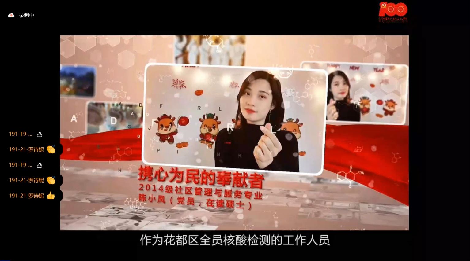 据悉,此次云汇报是社会工作/社区管理与服务专业在校3个年级线上综合实训成果的展示,以“益心益意,服务社会”、“风雨兼程,勇往直前”、“文化自信,智慧纷呈”三个篇章呈现专业课课程思政把价值塑造、知识传授和能力培养三者融为一体的实践成果。学院表示,活动是新时代社会主义接班人向建党100周年的赤诚献礼,也是一次用社会工作专业理论和方法进行疫情期间学生心理有效疏导的尝试。