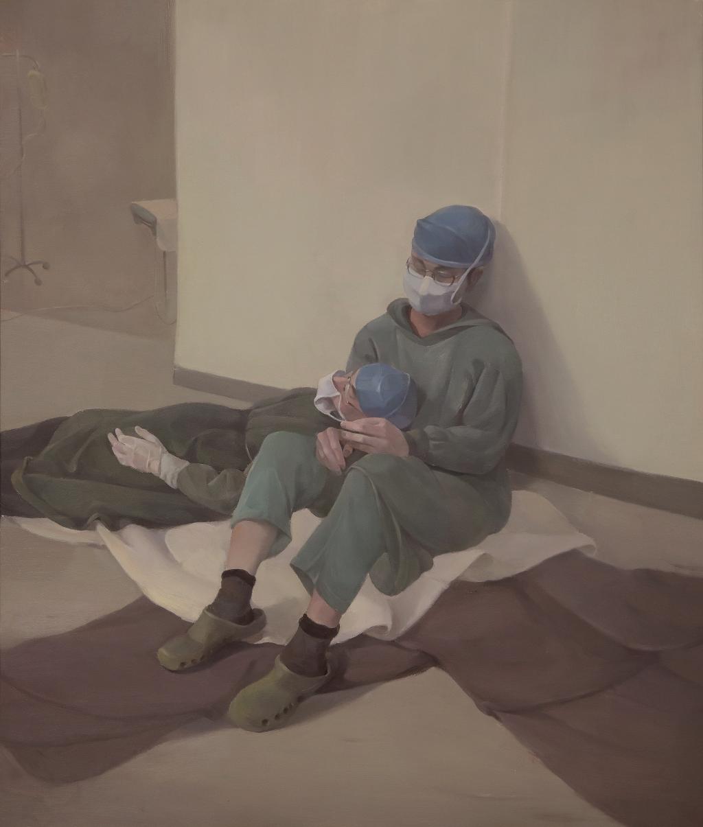 《生命守护者》是党景贺2021年在全国人民众志成城抗击新冠疫情之时创作的,作品描绘两名医生在经历长时间紧张的诊断治疗任务之后累瘫在诊室外的情景,表达了作者对广大医护人员崇高的敬意和对伟大抗疫精神的热情赞颂。