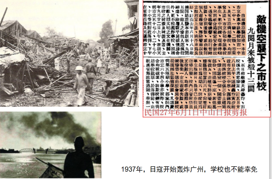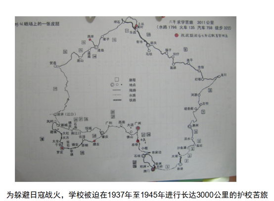 1937年,日寇开始轰炸广州,为躲避日寇战火,学校被迫在1937年至1945年进行长达3000公里的护校苦旅。