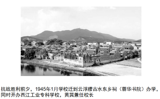 1945年1月,学校迁到云浮腰古水东乡祠(蓉华书院)办学,同时开办西江工业专科学校。