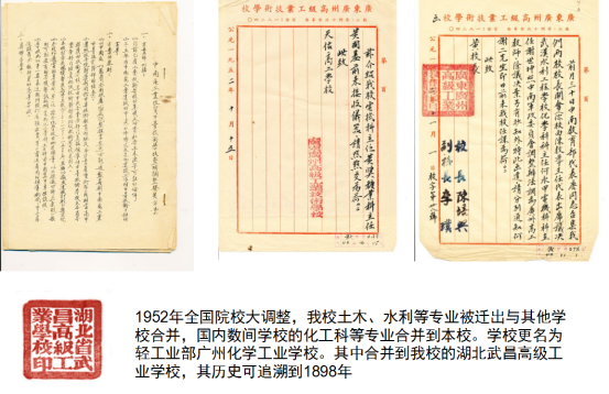 1953年春,广州高级工业技术学校与常德高级工业学校、郑州工业学校、湖北武昌高级工业学校、湖南工业技术学校、江西高级工业学校、萍乡高级工业学校等6校的化工科和糖业科合并组建中央人民政府轻工业部广州化学工业学校。