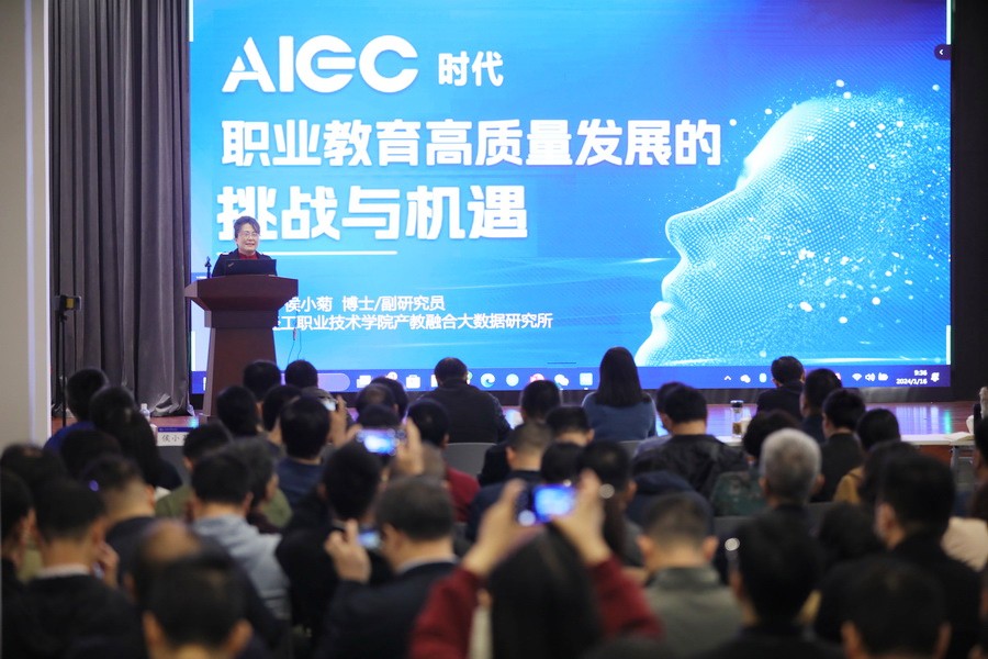 侯小菊以“AIGC(生成式人工智能)时代职业教育高质量发展的挑战与机遇”为题,围绕AIGC时代职业教育数智化人才培养面临的新挑战、大模型迅猛发展驱动数据范式改革创新迎来新机遇、AIGC时代如何实施职业教育高质量发展的新思考三方面,系统阐述了对AIGC时代职业教育发展的思考。她认为,人工智能改变了人力结构,调整了分配方式,使得人才链的供给和产业链的需求不匹配,大模型技术对职业教育人才培养的新职业新岗位、新专业新课程、双师型教师、实习实训、科研创新等方面带来了不少挑战。在职业教育中要创新应用AIGC,促使教育评价、教学资源、课堂教学更加客观精准、智慧高效,加速教育产品智能化升级,助力优质教育均衡发展走深做实。在信息化与虚拟化不可逆转的AIGC时代,我们要在共同数字化要素基础上,形成新的专业群构建规律,服务专业数字化要求,构建产教融合办学平台,扎实推进职业教育与重大产业布局精准匹配,要点燃、唤醒、激发学生的内在驱动力,培养具有智商、“搜”商、“问”商的创新型人才。
