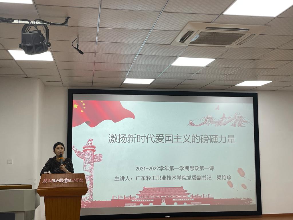 9月22日下午,在广州新港校区第一实训楼105教室,学校党委副书记梁艳珍以“激扬新时代爱国主义的磅礴力量”为主题,为我校会计201、202班的同学主讲了2021年秋季学期的“思政第一课”。