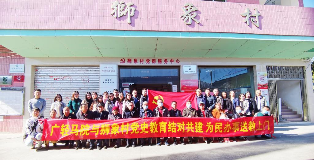 12月3日上午,马克思主义学院党总支26名党员教师前往革命老区吕田镇,与狮象村党组织结对共建开展党史教育,双方共同举办了一次以“为民办事送教上门:学习宣传十九届六中全会精神”为主题的党日活动。狮象村委会支书张观金与该村20名党员干部参加了本次活动。