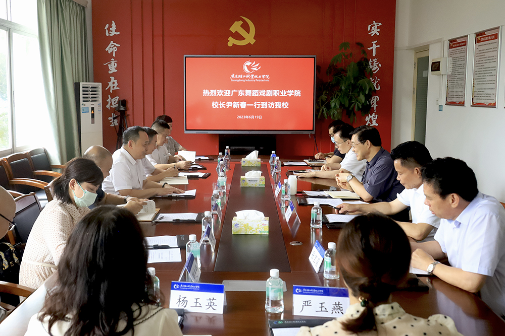 卢坤建与广东舞蹈戏剧职院的来宾座谈,并就我校“双高”建设取得的成绩,办学品牌特色,学校治理等方面进行了介绍,表示学校以教师下企业为抓手,探索产教科有效融合机制,建立跨专业(群)教师团队提高技术服务能力,推动人才培养质量不断提升。尹新春介绍了广东舞蹈戏剧职业学院的发展情况,对我校取得的成绩表示充分肯定,希望两校加强交流,共谋发展。