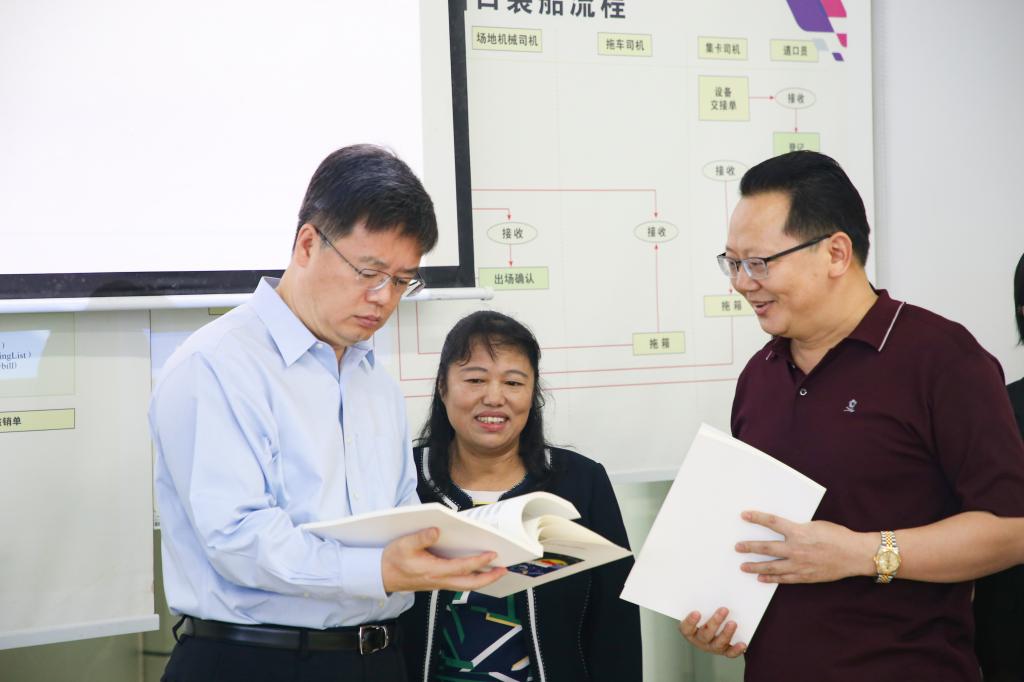 在北斗+智慧物流实验室,覃伟中、陈杭与我校专业教师亲切交谈,听取“区块链技术应用”教材建设情况介绍。