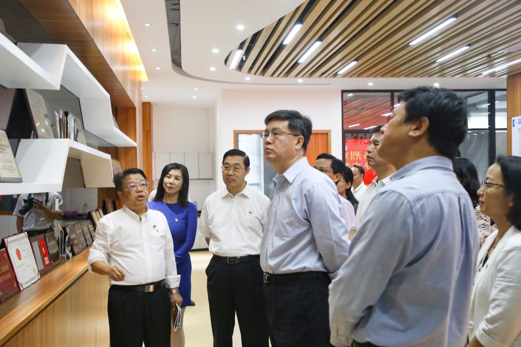 覃伟中在管理学院了解全国样板党支部和省首批高校“双带头人”工作室建设情况。