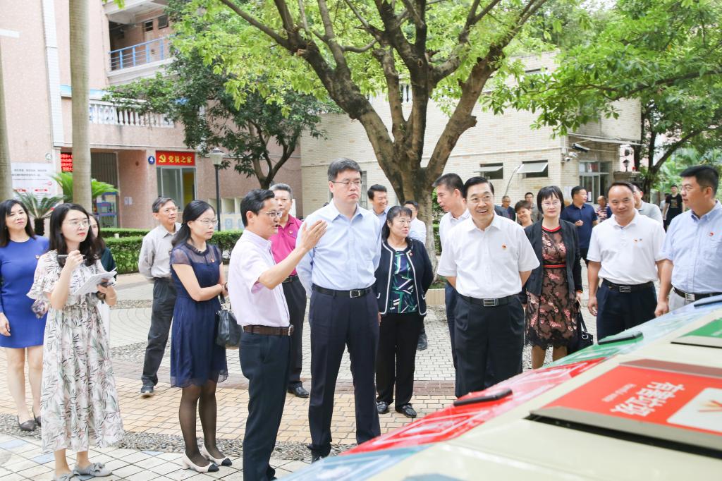 覃伟中现场调研参观我校互联网+智能垃圾分类系统、多功能文化食堂、校史馆、商贸产业学院、北斗+智慧物流实验室等。